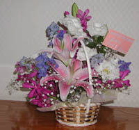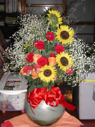今日はDORAおばさんの誕生日です。マーミとジュンちゃんが夕方ユリのアレンジフラワーを持ってお祝いに来てくれました。『Happy BirthDay 半世紀 ゴシュウショウサマ』だって。