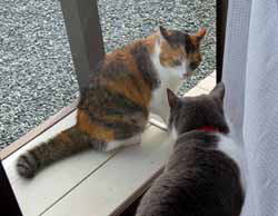 午後から近所の三毛猫が庭に遊びに来ていました。はなが大張り切りしていたよ。