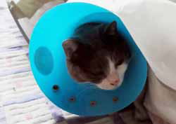 昨日、獣医さんへ行って注射をされて、今日も1日炬燵で寝ていたら、だいぶ元気になりました。エリザベスカラーが邪魔なので前に茶々が使っていた高さのある食器でご飯をもらっています。