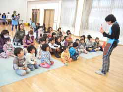 まず、季節の歌は♪オニハソト、フクハウチ♪の『まめまき』。その後はパネルシアターで、『せつぶん』という節分のいわれの昔話。「今年の子ども達はしっかり聞けるね」と担当さんが感心するほど子供達は身を乗り出して聞いていた。
