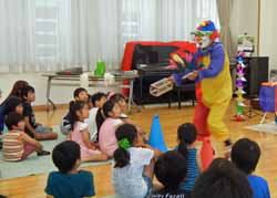 さて、手品の第1部はピエロになって登場。いわゆるテーブル手品の水の入ったコップを取りだしたり、花を取りだしたり、紐がまっすぐ立ちあがったり、子ども達はどこから出てくるのだろうと目を丸くして見ていた。