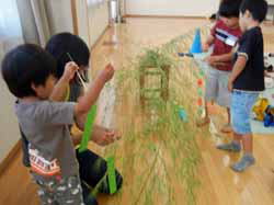 まずは七夕飾り。今年は工作担当さんが大きい子が多いという事で張り切って薄紙を使った網を作ったのでかなり時間を取られた。その後で貝殻を作り、さらに短冊に願い事を書いてかなり慌ただしく笹に付けた。