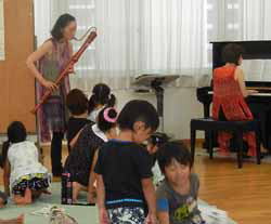 そんな楽器の色々の紹介を兼ねて何曲か演奏した後は子ども達もよく知っている歌を何曲か一緒に歌う。その後は小学生の子ども達でリコーダーを持ってきた子ども達にリズムの吹き方を教えて合奏。