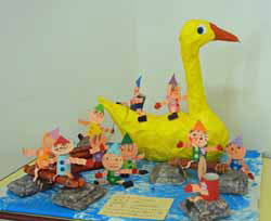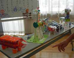 今月は工作。空き箱やトイレットペーパーの芯・プリンカップなどの廃材を使って動物を作った。最近の子は工夫をして何かを作る経験が少ないのか、有る物をそのまま無理に組み合わせてテープで張ってしまおうという作り方が多い。お母さんに器用な人がいて、そこの子ども達はかなりの大作を作ってくれた。また、大きい子ども達は足を作るのに胴の箱に穴を開けたりの工夫もしていた。また、フクロウを作った子、ダチョウを作った子はどちらも男の子だったが足が2本でバランスが取れずに、「胴に重りを詰めてバランスを取ってごらん」と言ったら、色々工夫をして何とか立つようにした。