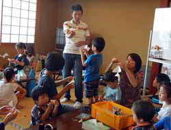 最後はリーダーさんの初仕事。出席カードとごほうびのお菓子をメンバーに渡し名札を回収、班のリーダーさん達が上手に協力をする所もあれば、お母さんやボランテアのおばさんの手を借りている所もあり、それでもだんだんに上手にできるようになるだろう。