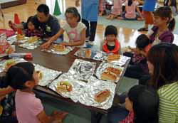 小さい子でも出来るようにホットドック用の背割れパンにマーガリンを塗りレタス・チーズ・ソーセージを挟んでマヨネーズやケチャップで飾るだけだが、あっという間に作って、あっという間に食べ終わり、「もっと食べたかった」と大きい男の子達からの感想が出た。