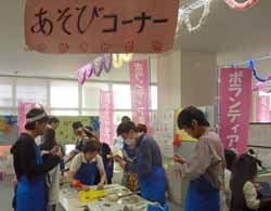今回は学生さん中心の遊びコーナーの手伝い。輪投げやボーリング、釣り、風船や新聞紙工作などの呼び込みと手伝い。スペースが狭いし奥まっているのので、うまく誘導しないと通り過ぎてしまう。