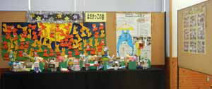 それぞれの施設の利用者さんのレベルに合わせて、手芸品や絵・工作・習字などが並ぶ。大勢で作った大作もあれば、先生について絵手紙や粘土細工など皆でそれぞれに工夫して作ったのだろうなというものもある。中には制作中の写真や作った人の思いなどが添えてある作品もある。また日頃の生活の様子などを写真やパネルにして紹介している所もある。