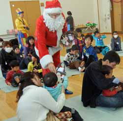 その後は多国籍のファミリー静岡さんのクリスマスプログラム。英語でクリスマスソングを歌ったり、手品?や風船細工、身体を動かしての遊び歌、最後には全員がサンタさんからプレゼントをもらった。