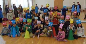 その後で少し時間をかけてオニのお面つくり。色画用紙を使って鬼の顔を折り、目と口を工夫して作って張り付け、頭に巻けるようにして出来上がり。出来たてをつけて皆で写真を撮った。