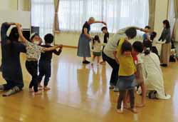その後は人数集めゲーム。ワッと数を集めて、そこから♪なべなべそこぬけ♪。勝手に動くとこんがらがって、まわるのに工夫がいるので、それぞれのグループで試行錯誤する。それでもみんな楽しそうにやっていた。