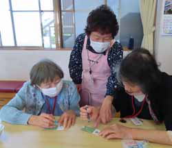 また、会長さんが持ち込んだ、厚さが微妙に違うカードを薄い順に並べるゲームもグループ分けをしてやった。花札サイズなのだが皆さんまだ指先の感覚は健在、ほとんど間違えずに並べておられた。