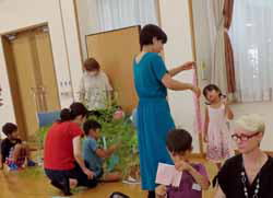 子供達は来た順に保護者も一緒に短冊に願い事。しっかりしたお願いも、その子にしか分からない文字のお願いも、七夕様には届くと良いな…。その後は薄紙の網やお花、折り紙のちょうちんや吹き流しなどを作ったり、お星さまを切り抜いたり。皆次々と作って飾っていた。それでも今年の子達は「お片付けするよ」と動き出すと一生懸命手伝ってくれる。