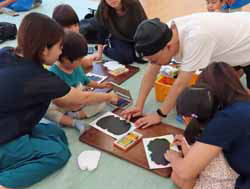 今日は絵本作家のむらまつけーじさんによるパステルアート。半分に折った黒い画用紙に作った型を置いてクレパスでつけた色を指で伸ばしていく。それを何段か重ねて「おばけ」をテーマにそれぞれのイメージで作った形に目玉を付け口を書くと何となくお化けらしくなるのが面白かった。同じ説明を聞いても、それぞれ個性的になっていくのも面白い。