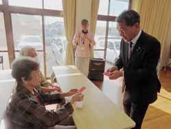 本日はまず、会が25周年で市の感謝状を頂いた報告から。市長も顔を出してくれ、挨拶の後、会員さんにトランプの手品を見せてくれた。今日はご挨拶は無かったが社協からも人が見えた。