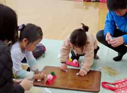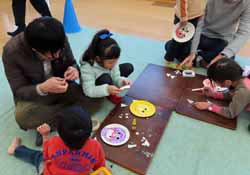 そしていよいよ紙皿を使って鬼のお面作り。毎年の事だが、色遣いといい表情といいそれぞれ個性的な鬼ができる。お母さん達も何人か「私も作っていい?」と目を輝かして参加していた。鬼のお面を披露して写真も撮って、いよいよ豆まきゲーム。と言っても豆では危ないので、新聞紙を丸めたボールを使って2チームに分かれて、的のじゅうたんに放り込み数を競う。だんだん的が小さくなるし、投げる力加減で飛びすぎるので、結構難しいがみんな楽しそうだ。最後は小学生の子達が得点を計算して勝敗を決めた。