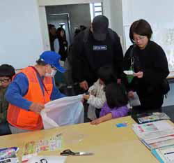 予定通り段ボール箱を使った簡易トイレの説明とゴミ袋を使ったポンチョ作り。終わった人には防災アンケートという事で意識調査。お子さんがポンチョを作った後で保護者の方にアンケートに答えてもらったりもした。何かやってもらった人には会場のポイントラリーのシールを貼る。このシールを3つ集めると景品がもらえるらしかった。