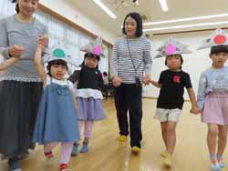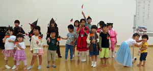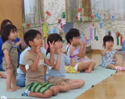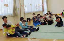 最後は例年通りじゃんけんゲーム。シールと紙を持って、違う相手を探しながらジャンケン、負けるとシールを相手に張ってあげるのだが、途中で「今度は勝った人がシールを張ってあげよう」と言ったらルールが理解できなくて泣き出す子がいたり、賑やかだった。