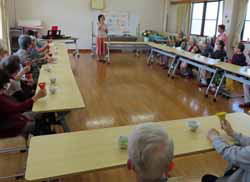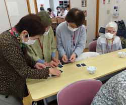 皆で何曲か歌を楽しんだ後で、厚さの違うカードを順番に並べるゲームをした。初めは興味の無さそうだった人も小グループでああだ、こうだと言っている内にすっかり仲間に入って、答え合わせを楽しんでいた。
