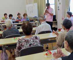 その後は今年もフラダンスの皆さんの踊りで夏を楽しんだ。今回は♪涙そうそそう♪を「手だけでも皆さんも一緒に」と教えてもらって会員さんもボランティアさんも楽しそうにまねをしていた。