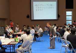 最近の防災計画の話や避難所の現状、焼津VCの説明などの後、HUGの説明と条件設定。ここまでを全体でやって小グループへ。