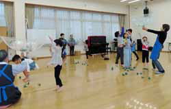 その後は玉入れ。そしてトイレットペーパーの芯に新聞紙を輪にしたものを投げて掛ける輪投げ。芯が軽いので勢いをつけると倒れてしまい、加減が難しそうだったが、それぞれの工夫で楽しんでいた。そして縄跳び。上手にできる子や、お母さんと一緒に飛ぶ子、ただ縄を振り回している子など…。