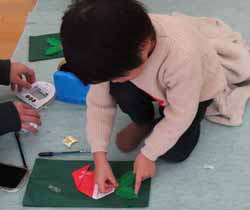 その後はいよいよ工作。まずはいがぐり変身、画用紙の表に栗のイガ風に切った折り紙、反対側はやはり折り紙を切って作った栗の実を張って間に竹串を挟む。竹ぐしをストローに入れ、もう1本のストローで紙の端の方を吹くとクルクル回るというもの。