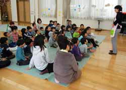 最後は大型絵本の読み聞かせ。さすがにボランティアさんが少ないので、写真ばかりというわけにもいかず、遅れて来た子のチェックをしたり、「トイレ」「手を洗う」などと言う子供達に付き添ってドタバタだった。