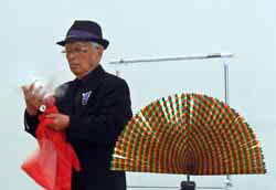 まず鳩を出して、子供達を喜ばせたのは良いが、鳩が元気に飛び回ってますます子供達が喜んでしまい、取り囲まれた鳩にはいささかかわいそうだったかも…。その後は花を出したり布を出したりの手先のマジック。