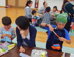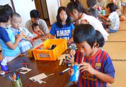 まずは来た子供達から七夕飾り。願い事を書いた短冊と投網や星、提灯などを作り大きな竹に飾りつけていく。案外お母さん達が楽しんで作っていた。