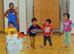 最後は新聞を丸めた豆を使って、ゲーム。段ボールの鬼に投げて得点を競ったり、的のじゅうたんにどれだけたくさん投げ込めるかを競ったりした。