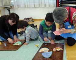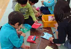 とにかく子供たちの出足が遅かったが、お雛様を作っている内に集まってきた。それぞれに切ったり貼ったり組み合わせたりして内裏雛が完成。ひな祭りの歌を歌って祝った。