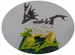 介護施設・就労支援施設・高齢者施設と様々だが、工作・手芸・習字など力作が並んでいた。その中でも普段作業で作っている洗濯バサミを組み合わせて恐竜にしたという作品に引き付けられた。ほとんどがお手本に合わせて皆で作りましょうの中から良くできたものか本人が気に入ったものを出しているのだろうが、これだけはとても異色のアイデアに見えた。また、今時らしくパソコンを使った作品もいくつかあった。