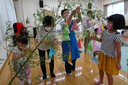 まず、短冊に願い事を書いて、飾りは星と網。星は型抜きではなくて折り紙を折ってハサミで切って作るのを子供のお母さんが教えてくれた。