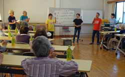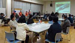 簡単な説明の後でHUG(避難所運営ゲーム)。様々の避難者やトラブル、新しい情報に対処していく。じっくり検討していく形も良いが、今回私のグループはなるべく数をこなして、どんな状況があるのかのイメージを付けてもらいたいと思って進めた。高齢者、孤児、病人、怪我人、外国人、障害のある人、旅行中の人、犬・猫・ハムスターに小鳥とペット連れの人や盲導犬、電気・ガス・水道などが止まっても、人間が集まっているのでトイレは我慢できない、どうするのか、物資は今は何もないが、もたらされた時にどう分配するのか、簡易トイレやシャワー、物干し場、給水車をどう配置するのか、マスコミやボランティアにどう対応するのか、「そんなのあり?」をたくさん知っている方が、いざという時の対応力が広がると思う。