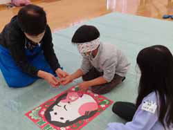その後はお正月遊び色々。最近は多分家でもやらない福笑いとかお手玉など。ケン玉も人気で上手にやる子もいる。後はバドミントンや羽根つき。「いろいろな事にチャレンジしよう」と10分交代でやりたい事にチャレンジ。皆大いに楽しんだようだ。