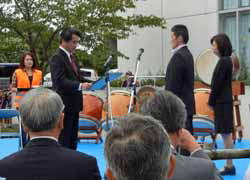 お天気が危ぶまれたが開会式は何とか外で出来た。昨年ロータリークラブが臓器移植のキャンペーンをし、それにこたえて死後角膜提供をされた方が2名あって遺族の方に厚生労働大臣の感謝状が市長を通して伝達された。