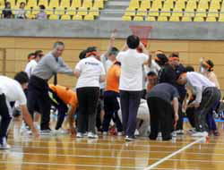 市議会開会中で市長をはじめ議員さん方も見えなかったが、自治会長さん方が多く見えていた。ここでは開会式の後で皆でラジオ体操第1。初めの競技の玉入れではお客さんも何人か各チームに加わって一緒にやった。