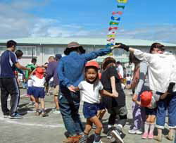 年中・年長の2クラスだけだが、保護者・祖父母・卒園した1年生、これから入園を考えている未就園の子ども達まで巻き込んで、徒競走・ダンス・障害物競走・玉入れなど賑やかなレパートリーになった。また、お父さんを中心とした保護者の綱引きはかなり本気で見ごたえがあった。