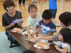 後半はサンドイッチ作り。とはいっても小さい子もいるのでホットドック用の背割れパンにレタスやチーズ・ソーセージなどを挟んでマヨネーズやケチャップで飾るだけ。