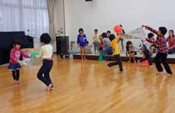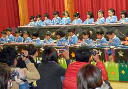 そんな訳で初めは2〜3歳児クラスとその家族などのお客さんで始まり。園長先生のお話の後、3歳児(3〜4歳)がお兄さん・お姉さんなので頑張って歌と楽器の合奏でオープニングの役目。泣く子もなく、とてもしっかりと出来た。ただ、残念なのがお客さん席のお父さん・お母さんがカメラやビデオで写すのに夢中で拍手が元気がなかった事だ。