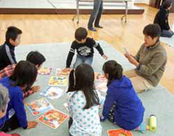 カルタは幼児と小学1・2年、3年以上に分けて俳句かるたは2〜3人で10枚の札を使って何度か、その後で20枚に増やしてもう少しやった。その後は大型かるたを年齢ごとの3グループで、これも札を少なくして取りやすく、早く終わる方法で札をグループごとに交換しながらやった。