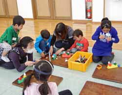 その後はお正月遊び。上手に独楽やけん玉をする子もあれば、お母さんと福笑いをする子、何人かまとまって双六をする子など「すぐに止めないで10分位は続けてごらん」と言われてチャレンジしていた。