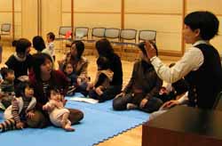 幼稚園前の乳幼児がママやおばあちゃんがやって来る。おとなしくママの側にいる子がある一方、興味津々に部屋の探検をする子、なぜか部屋の外へ抜け出そうと試みる子供達が多いが、これは階段が危ないので通せんぼ。