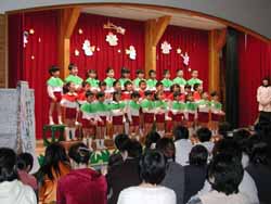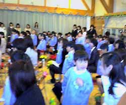 直前まで風邪ひきさんが多かったようだが今日は無事に全員そろったようで、園長先生もホッとしていらした。卒園のクラスは24名。お客さんとお父さん・お母さんの待つホールに入ってくる子供達、どの子も精一杯緊張して顔が引き締まっている。