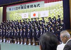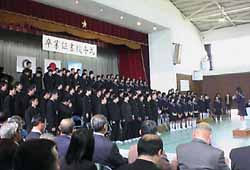 生徒達が構成した3年間を振り返る『旅立ちの瞬間』では、この学校は市内の中心にありいくつもの小学校から入ってくる上に大所帯なので、1年生に入ってからクラス・学年として組みあがるまで先生方も子供達も苦労したようだ。友達を作る・仲間を思いやるという事に目標が置かれていたようで、それだけに卒業も格別の感慨があるらしく、女の子だけでなく男の子達の声も震えがちだった。