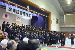 4クラス、124名が卒業。壇上に上がって担任から名前を呼ばれると、一言ずつ将来の夢や中学へ行ってやりたい事などを発表して校長先生から卒業証書を受ける。