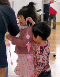 さて、今日は細かい作業なので子供達だけでなく子供を手伝うお母さん達もかなり真剣にやる気満々。今年は子供達が小さい分、親も毎回大勢が来ているのでお母さん同士の交流や協力も良く、万事スムーズに動く。紐を使ってお雛様と桃の花をつなげるつるし雛が完成した。