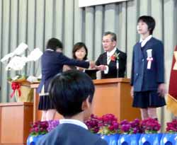 今年の卒業生は3クラスちょうど100名。こちらの学校は風邪引きが多いのか、あちらこちらの席から咳き込む音が聞こえる。つつがなく卒業証書を全員が受け取った後の祝辞で、学校後援会長さんが、「たとえば年賀ハガキのくじで999999があったら珍しいでしょ」という話を始めた。「だけど999998だって1枚だけだし、123456だってあるんだ、1人1人が皆違ってみんな大事な1人なんだよ」という話をされた。なかなか良い話だなぁと聞いた。