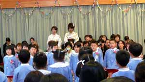 今年もお父さん・お母さん・おじいさんやおばあさん、さらには兄弟の来ている家もありギャラリーは賑やか。みんなの待つ中を卒園する子供達が1人ずつ緊張して入ってくる。今年卒園する子達の中に2人足の少し不自由な子がいたのだが、それぞれしっかり歩いたり1段上がったり立ち止まったりができるようになっていた。